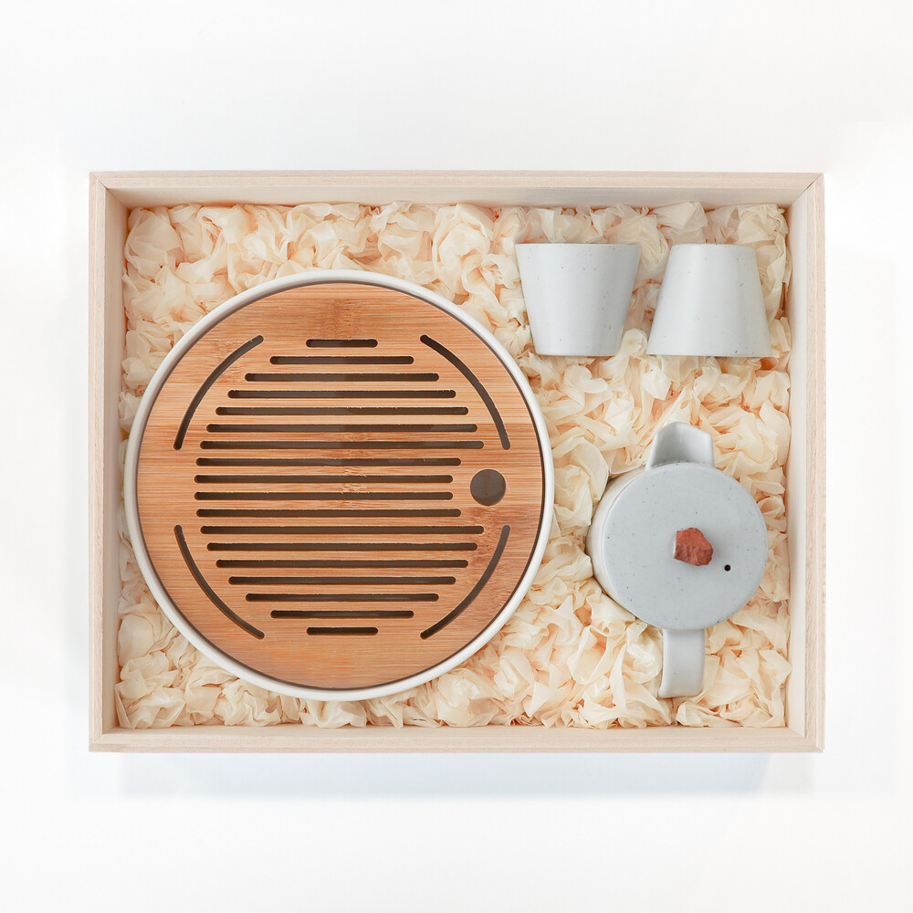 아침햇볕 대나무 차판 화이트 다기 선물세트