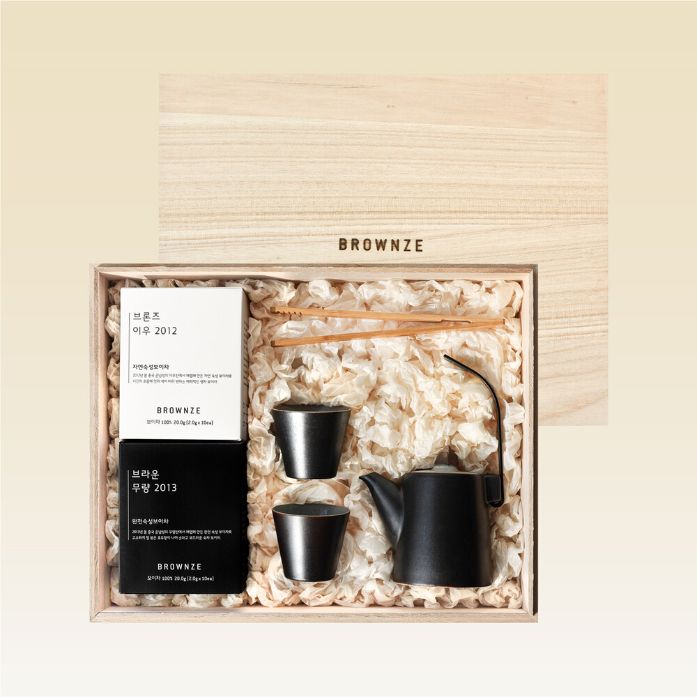 오동나무 상자 안에 브라운즈 시그니처 보이차 티백 2종과