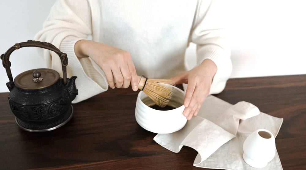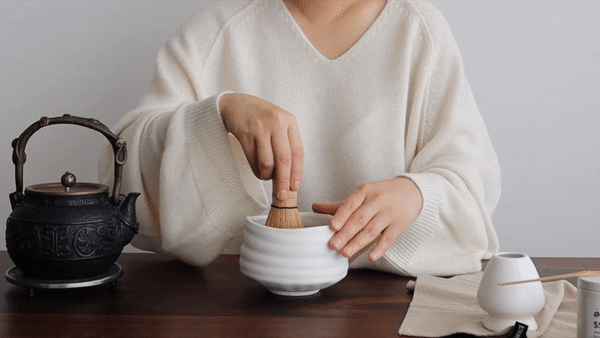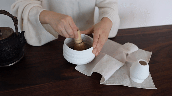 차완에 말차와 따뜻한 물을 붓고, 차선으로 빠르게
