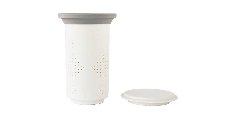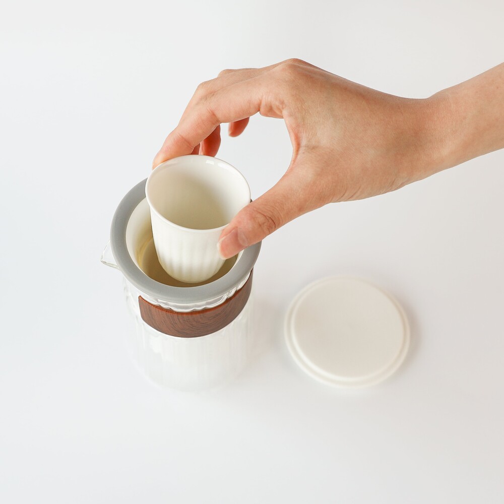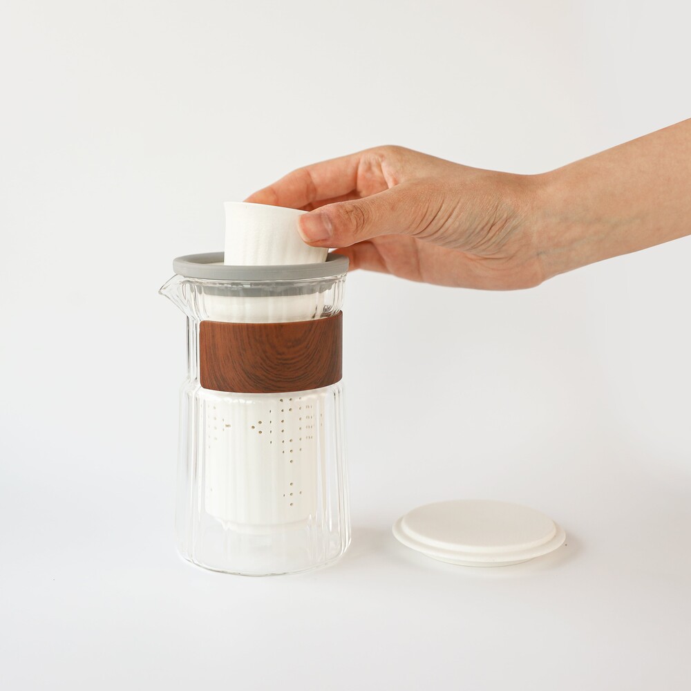 세로로 길게 뻗은 모양의 유리 다관에 하얀 인퓨저를 담아 사용하면