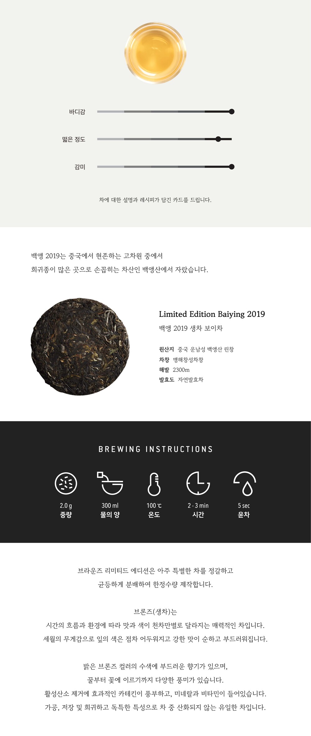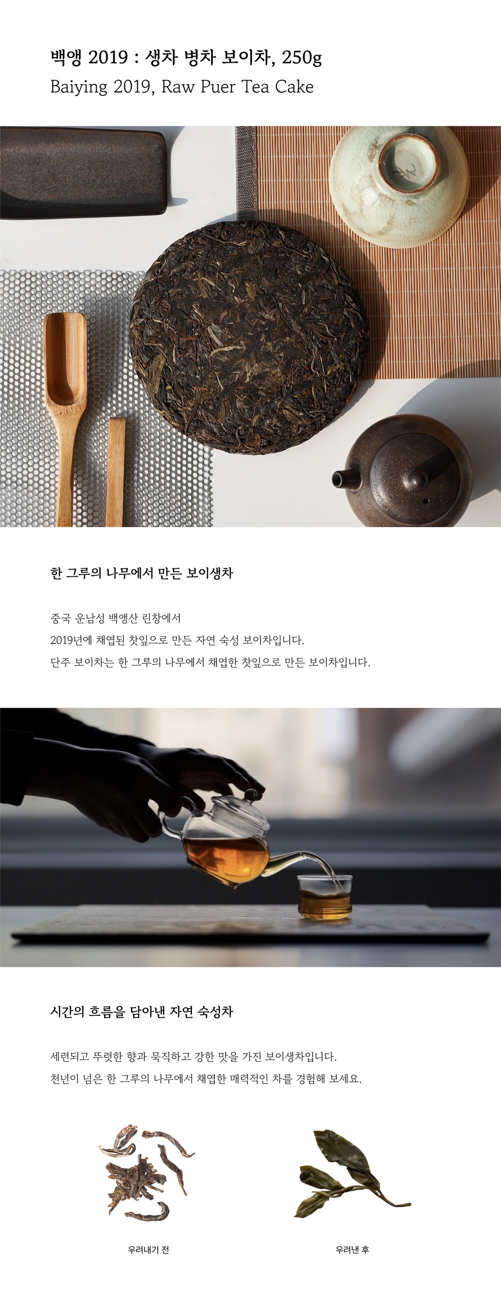 [브라운즈] 백앵 2019 : 생차 단주 보이차 병차 250g
