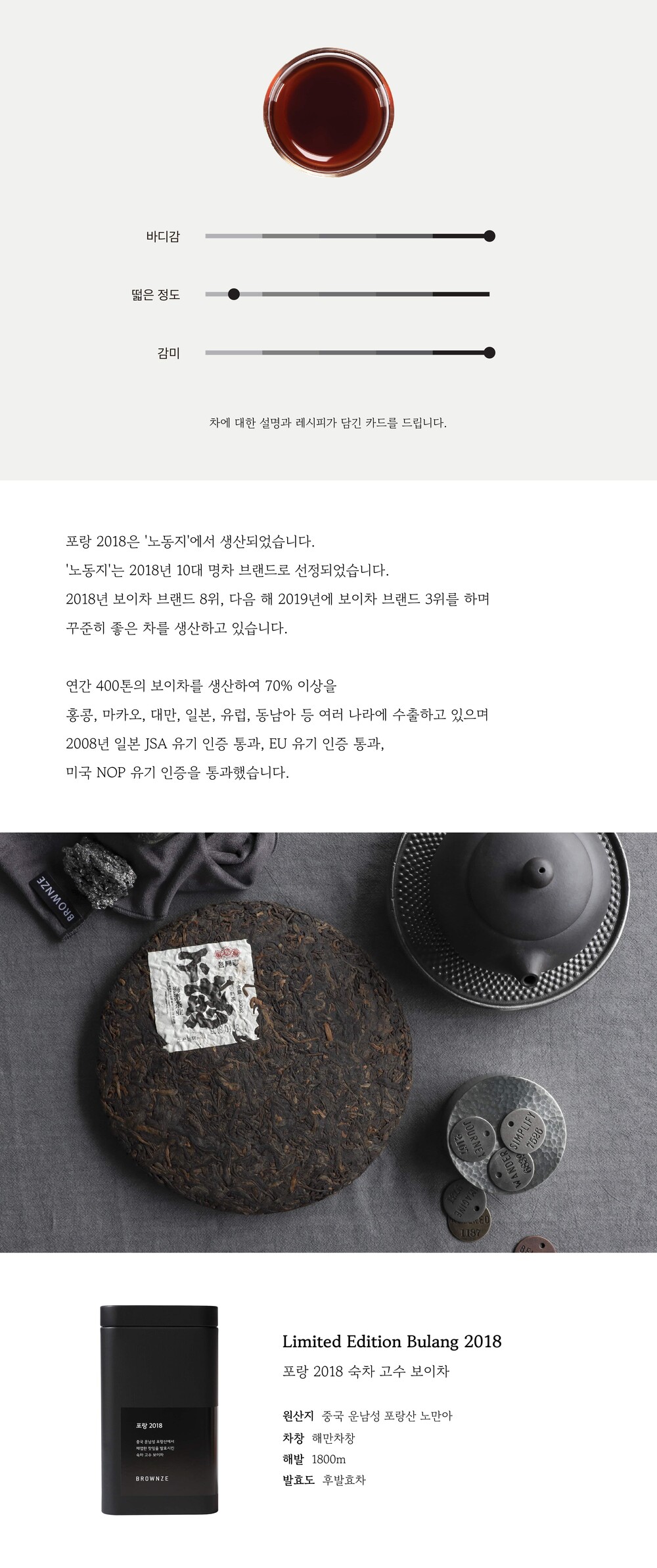 중국 운남성 포랑산 노만아에서 2018년에 채엽된 찻잎으로 만들어진 완전 숙성 보이차입니다. 포랑산의 노만아는 포랑산 내에서도 역사가 오래된 마을로 건강한 나무가 많은 차구입니다. 노만아 차구의 특징을 그대로 담아내 깔끔하고 목넘김이 매끄러우며 진한 풍미를 가진 보이숙차입니다. 포랑 2018은 ‘노동지’에서 생산되었습니다. 노동지는 2018년 10대 명차 브랜드로 선정되었습니다. 2018년 보이차 브랜드 8위, 다음 해 2019년에 보이차 브랜드 3위를 하며 꾸준히 좋은 차를 생산하고 있습니다. 연간 400톤의 보이차를 생산하여 70% 이상을 홍콩, 마카오, 대만, 일본, 유럽, 동남아 등 여러 나라에 수출하고 있으며 2008년 일본 JSA 유기 인증 통과, EU 유기 인증 통과, 미국 NOP 유기 인증을 통과했습니다. 브라운(숙차)은 온도와 습도, 통풍 상황을 고루 조절하며 발효한 보이차입니다. 잎의 색은 옅은 갈색에서 짙은 갈색까지 다양하며, 단단하게 긴압하여 기름을 바른 듯 매끄럽고 윤기가 있습니다. 브라운 컬러의 수색을 띠며, 고소하게 잘 볶은 호두향이 순하고 부드럽습니다. 산화 방지제, 폴리페놀, 비타민 및 소화에 도움이 되는 에센셜 오일을 함유하고 있는 음료입니다.