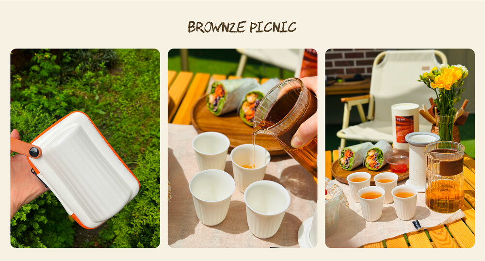 찻잔이 담긴 인퓨저를 다관에 담아 피크닉백에 담으면