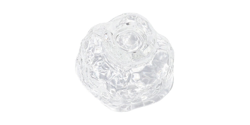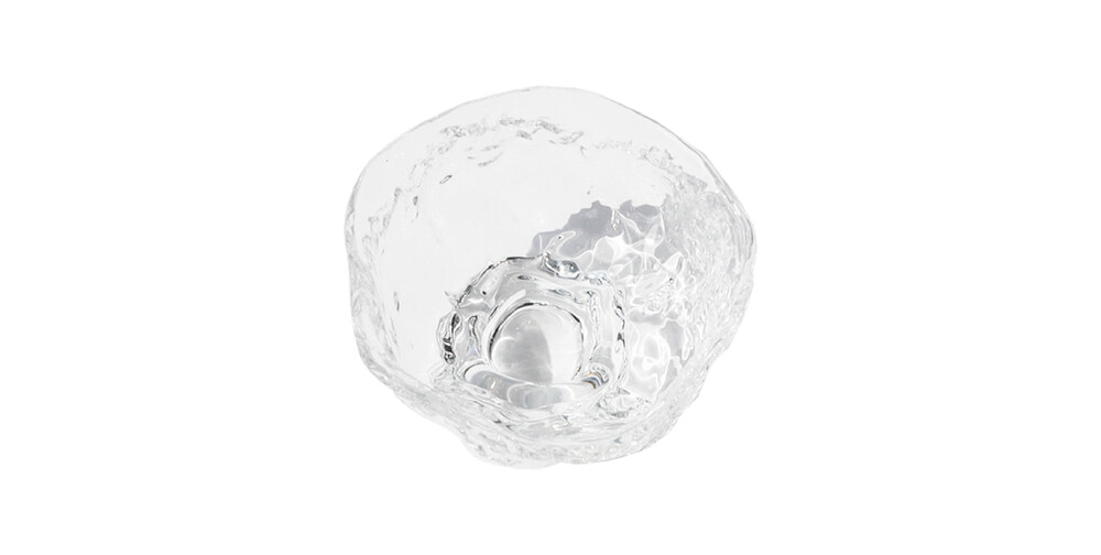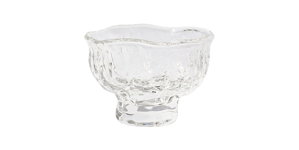 납작복숭아를 닮은 만듦새의 결이 살아있는 유리 잔입니다.