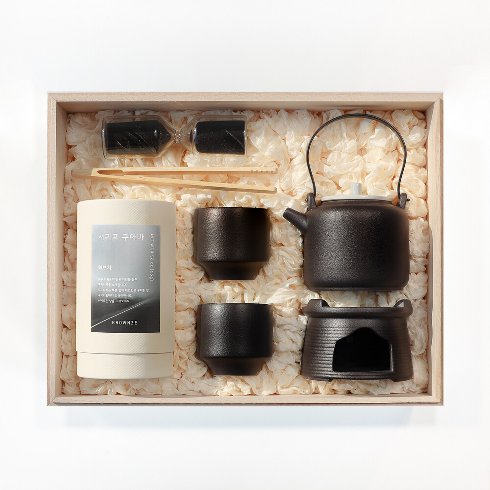 오동나무 상자 안에 서귀포 구아바, 달빛 도자기 다관 워머 세트,