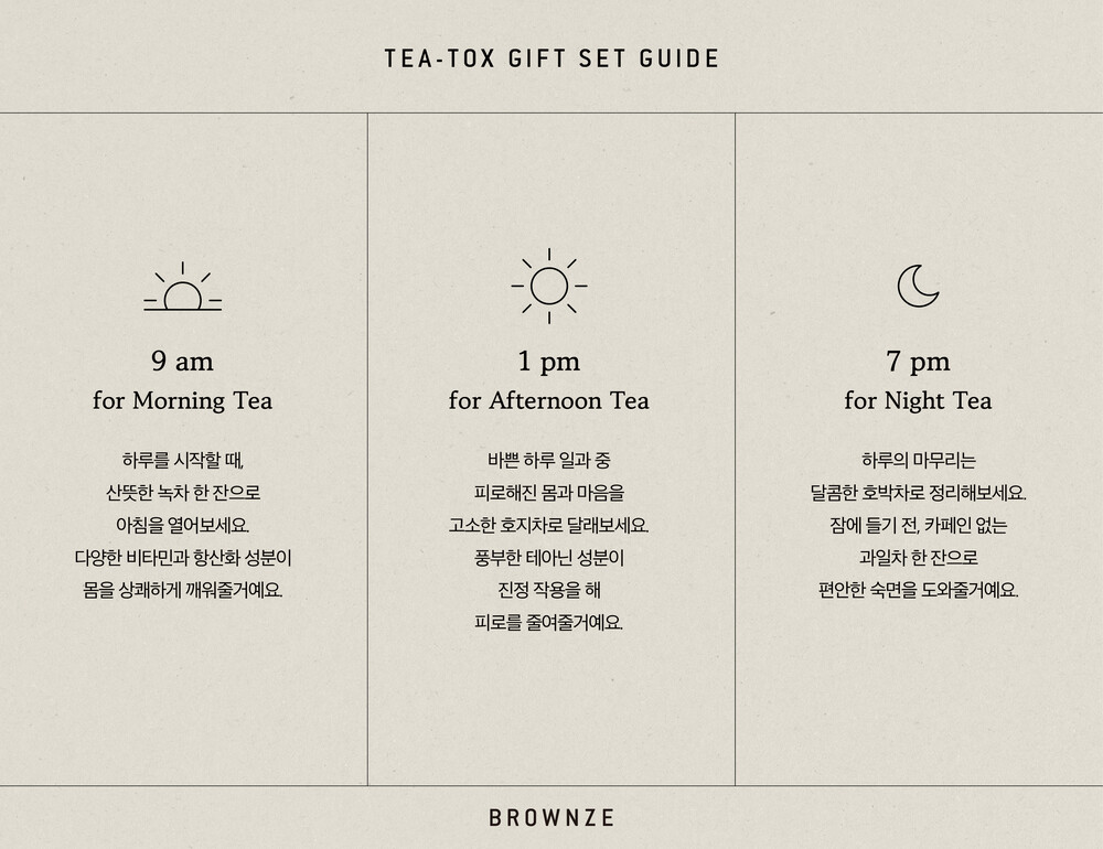 디톡스 차 3종 세트로 하루를 건강하고 산뜻하게 보내세요.
