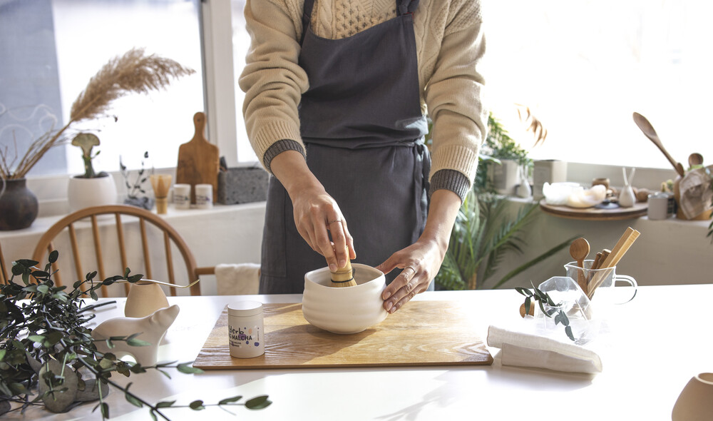 차완에 말차와 뜨거운 물을 붓고, 차선을 빠르게 움직여 풍성한 거품을 내어 사용해보세요.